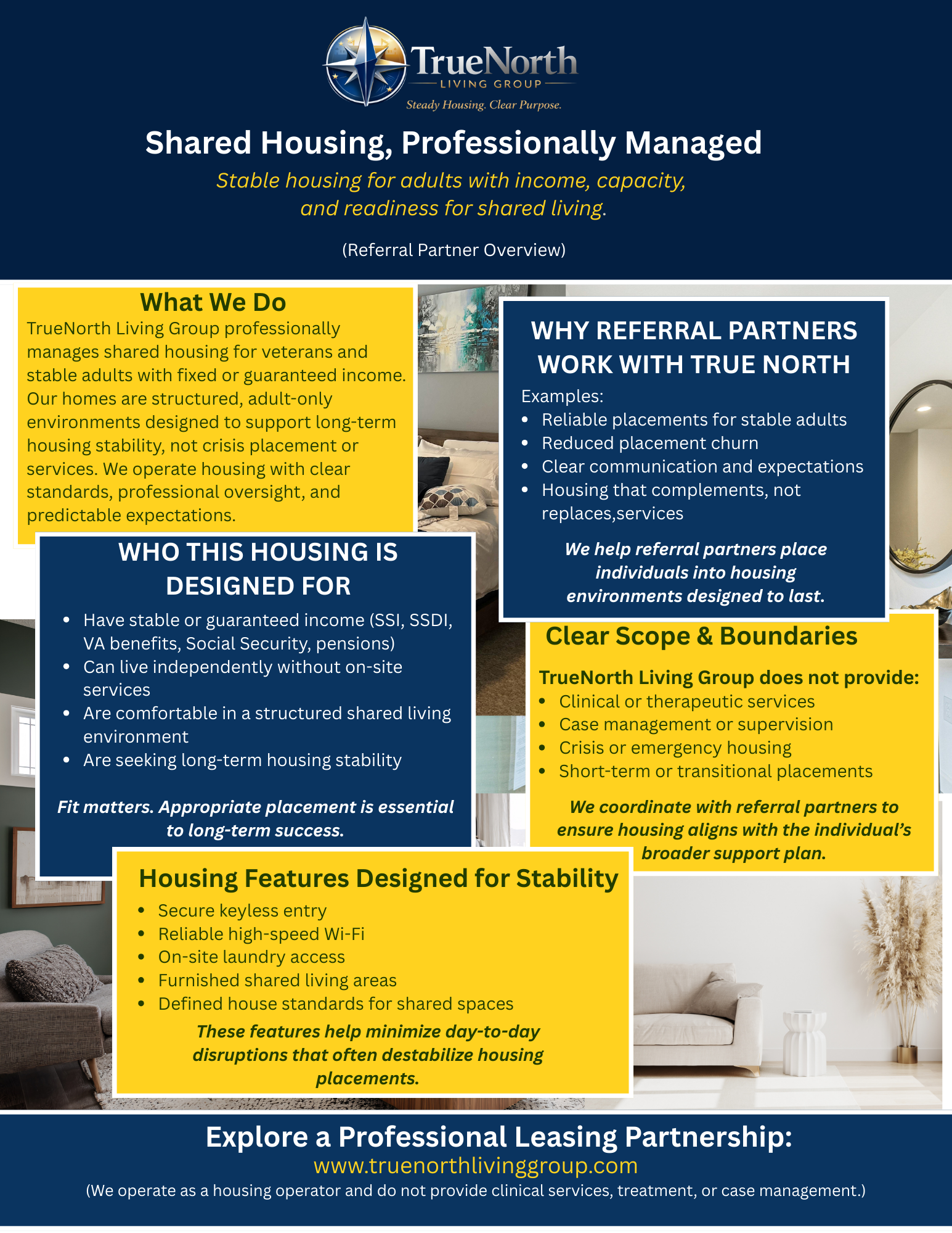 TrueNorth Living Group partners with organizations and property partners who are looking for stable, long-term shared housing, not short-term or crisis placements. Our model prioritizes fit, clarity, and consistency.